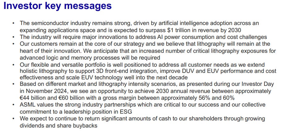 I’ve previously covered ASML, and after reviewing their 2024 Investor Presentation last November (link to my article 👉 here), I’m positively surprised by today’s results. They not only reinforce ASML’s long-term growth prospects but also address market concerns and offer some golden nuggets on AI, key growth drivers, recent DeepSeek developments, and industry trends beyond 2025.