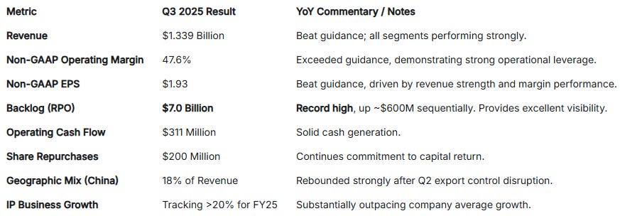This quarter reinforced Cadence’s status as an indispensable partner for anyone building AI infrastructure. Well… almost anyone, except China despite short-term normalization. That remains the wildcard, and it’s one factor out of Cadence’s hands.