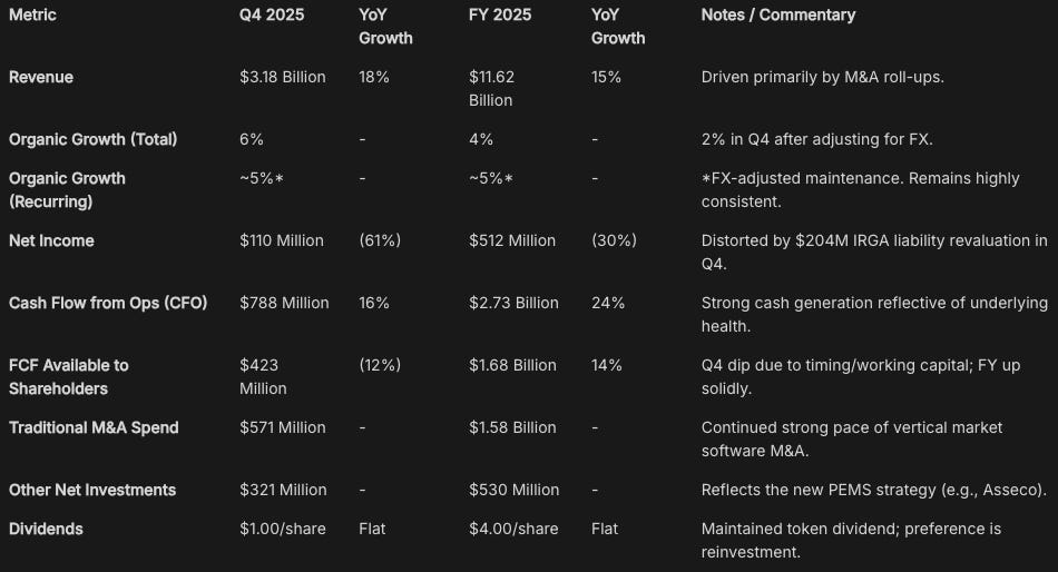 M&A volume: $571 million deployed in Q4 for traditional acquisitions, with the pipeline remaining full. Private market valuations haven’t contracted meaningfully, but CSU’s funnel of prospects is intact.