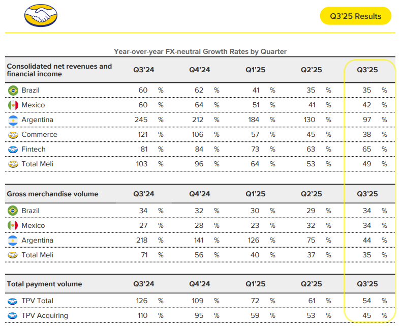 The results? User growth of 29% YoY in Brazil, the fastest pace since Q1 2021. Items sold accelerated sharply to 42% YoY (from 26% in Q2), and FX-neutral GMV grew 34%.