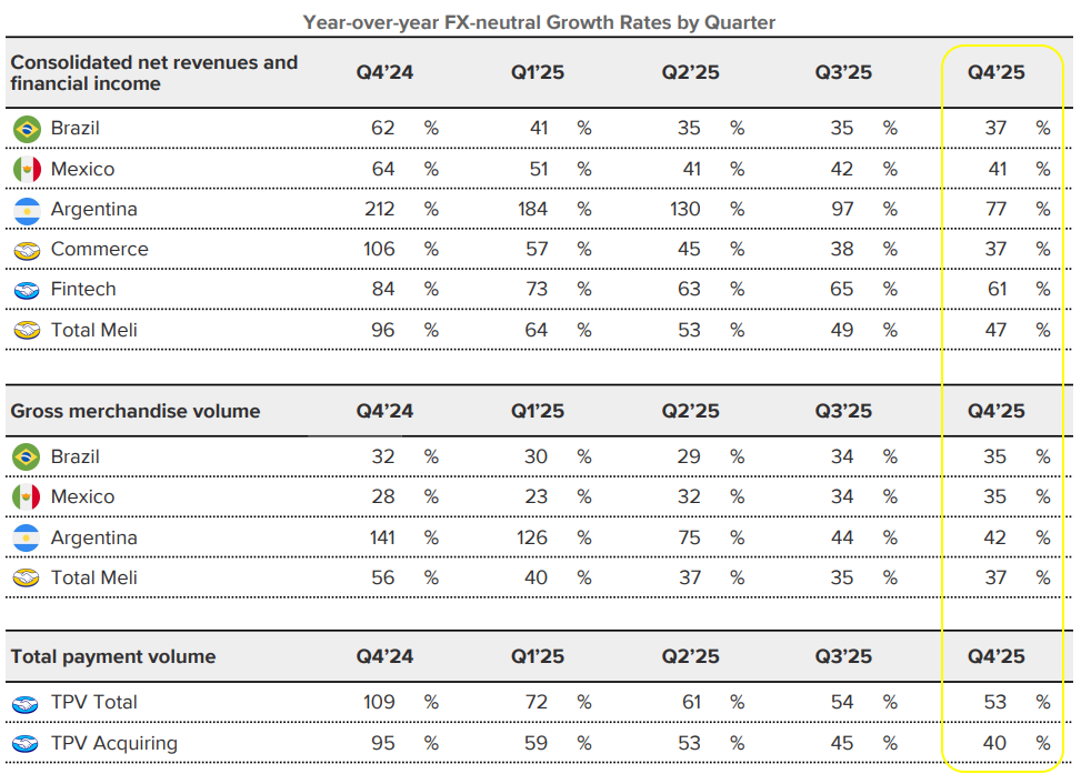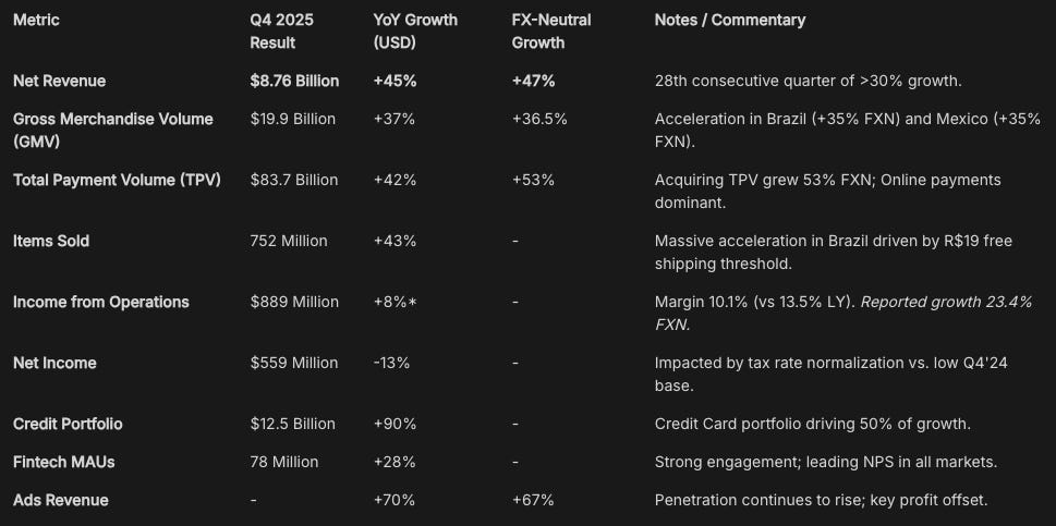 Mercado Libre reported Q4 2025 earnings that perfectly encapsulate, once again, why this company remains one of the most compelling growth stories in public markets. The headline numbers: 45% revenue growth to $8.8 billion, but operating margins compressed 340 basis points to 10.1%.
