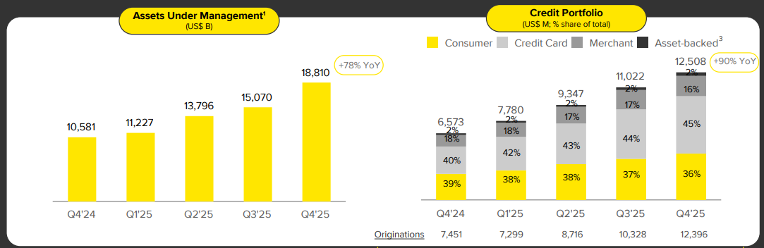 Assets Under Management grew 78% YoY, driven by interest-bearing accounts. This matters because MELI is starting to fund its massive credit expansion (credit portfolio up 90% to $12.5 billion) with customer deposits rather than wholesale funding. This is how you build a bank, not just a payments rail.